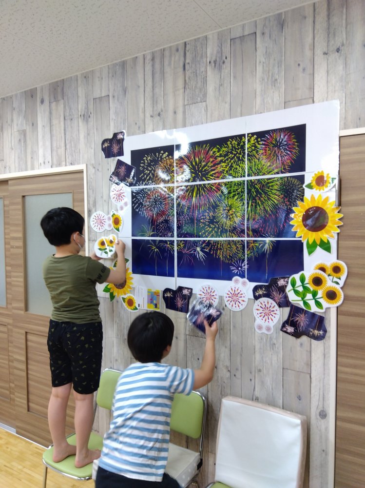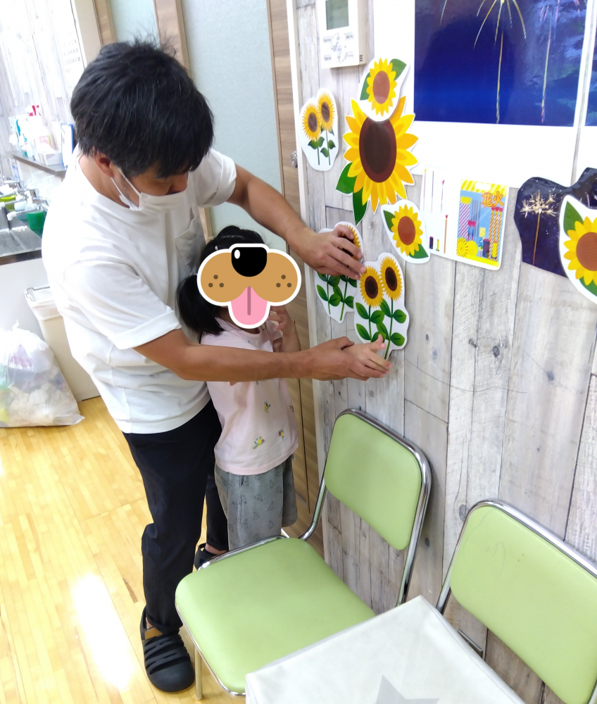 さて、毎月の季節行事、8月の飾りつけはひまわり🌻と花火🎆です。