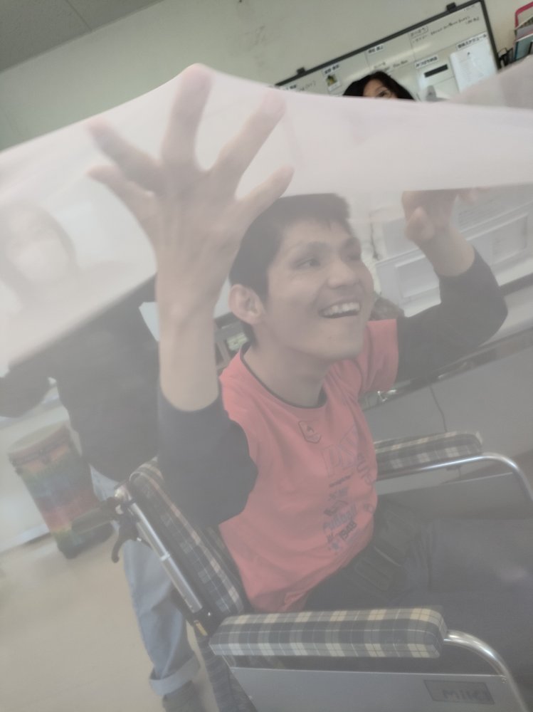 シルク(風)の大きな布の下に入る人、外でひらひらと揺らしてくれる人に分かれ