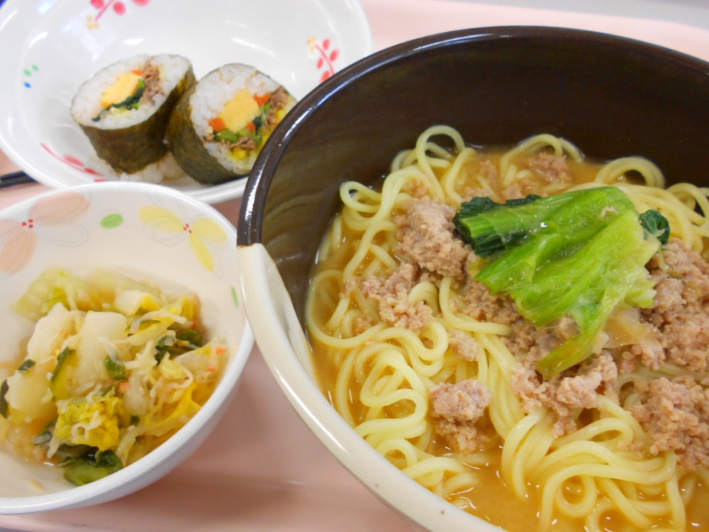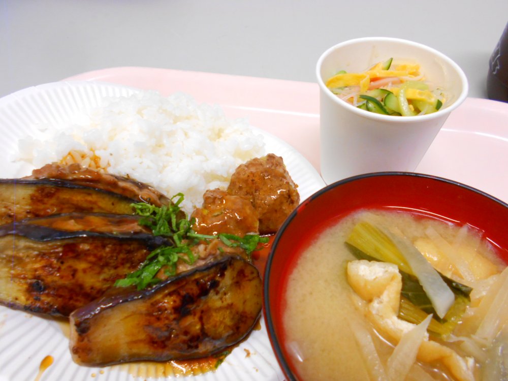 ご飯、みそ汁、ナスのはさみ焼き、つくね、春雨サラダでした。