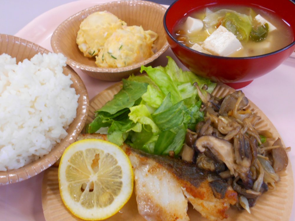 ごはん、なめこの味噌汁、ポテトサラダ、きのこのソテー、レタス、タラのムニエル、レモン