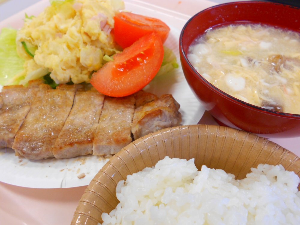 今日のメニューは「ご飯、中華スープ、ポークソテー、ポテトサラダ、トマト、レタス」でした!(^^)!