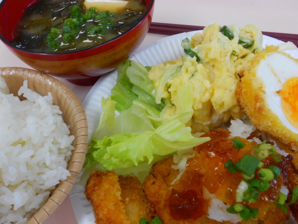 ご飯、みそ汁(豆腐、わかめ、あおさ、小ねぎ)、マグロかつ(小ねぎ、大根おろし、ゆずポン酢ジュレ乗せ)、ポテトサラダ、レタス、ゆで卵フライ( *´艸`)