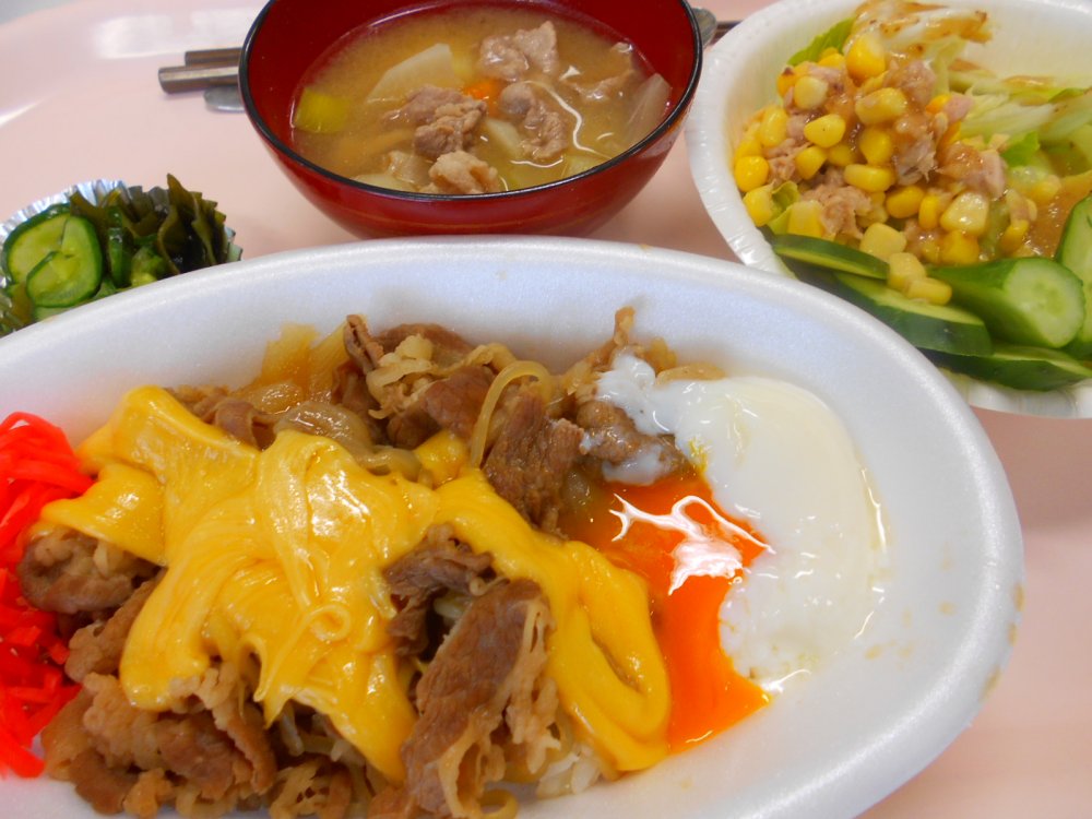 とろ~りチーズ&温玉乗せ牛丼、豚汁、キュウリの酢の物、サラダでした。
