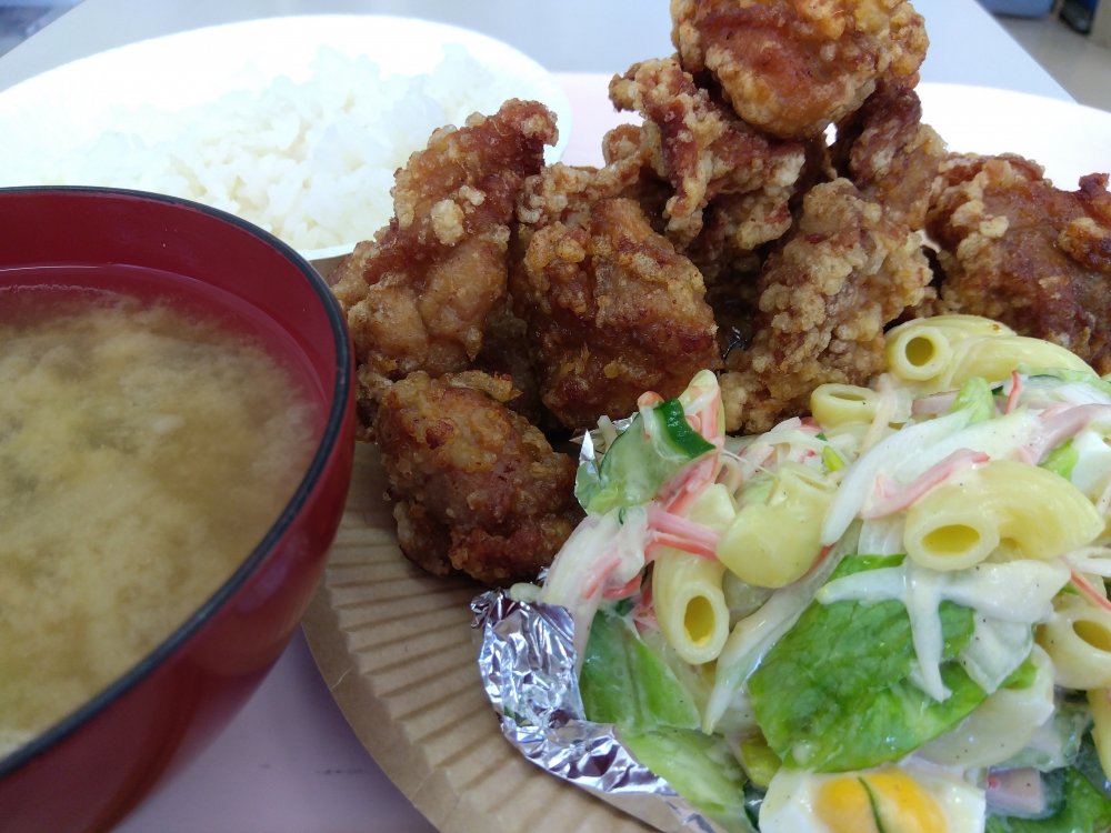 ごはん、みそ汁、マカロニサラダ、唐揚げでした😁