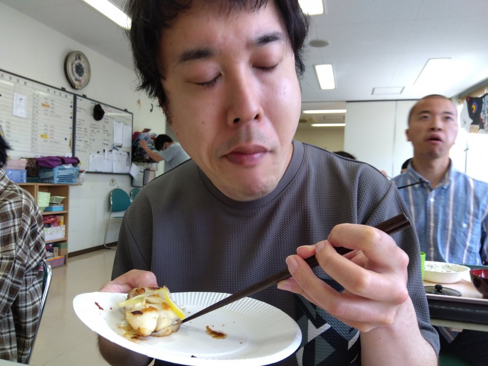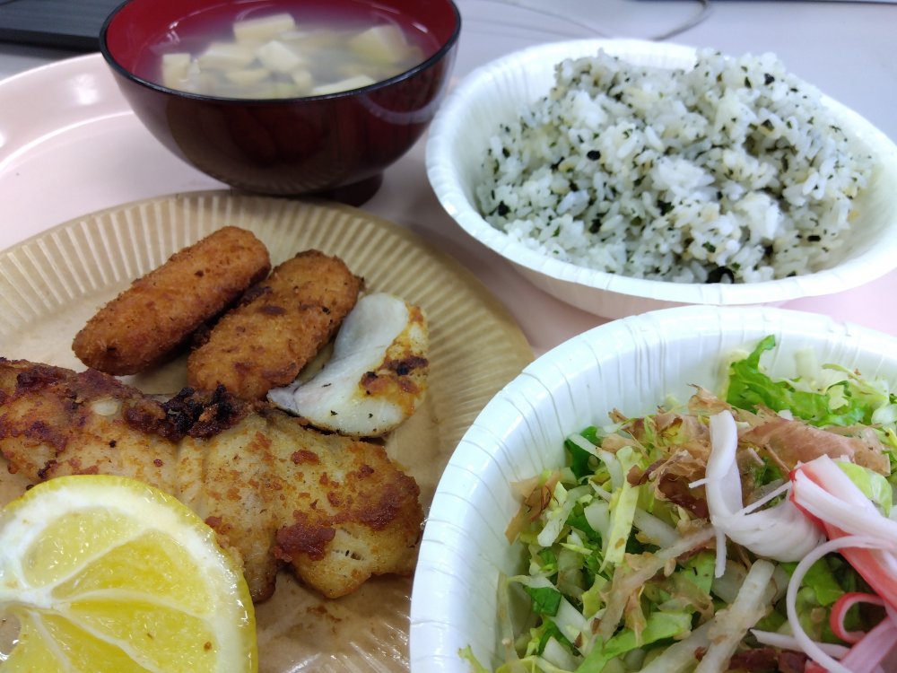 わかめご飯、タラのムニエル、ささみチーズフライ、せん切り野菜のサラダ、あさりと豆腐のお吸い物、みかんゼリー🍽️