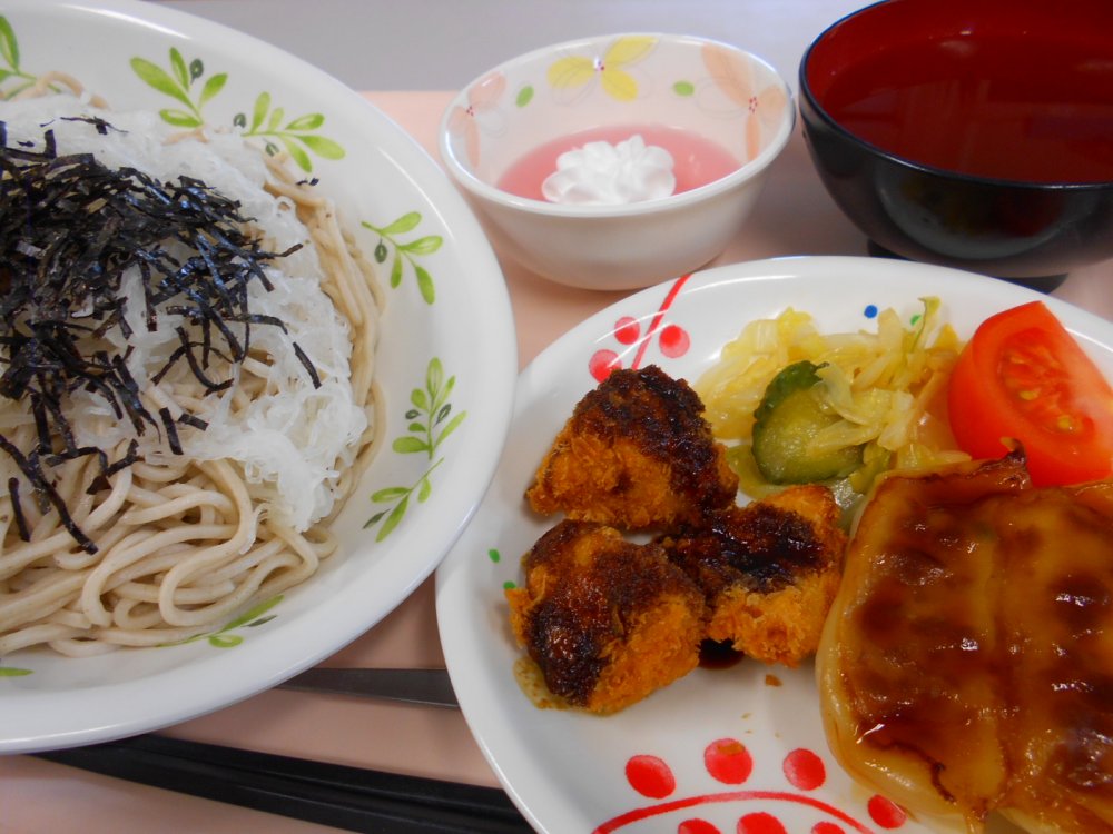 炊き込みご飯、豚肉のカリカリ揚げ、ポテトフライ、サラダ、みそ汁。
