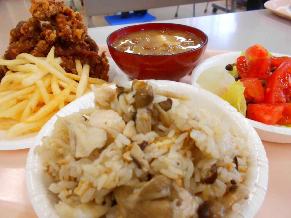 炊き込みご飯、豚肉のカリカリ揚げ、ポテトフライ、サラダ、みそ汁。