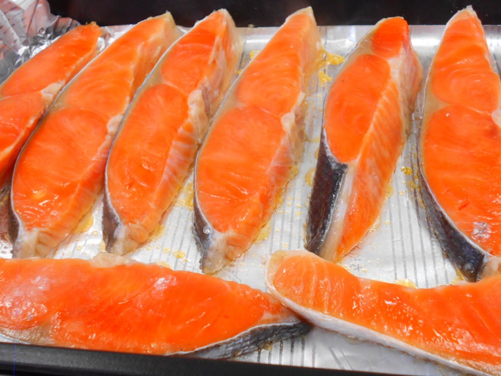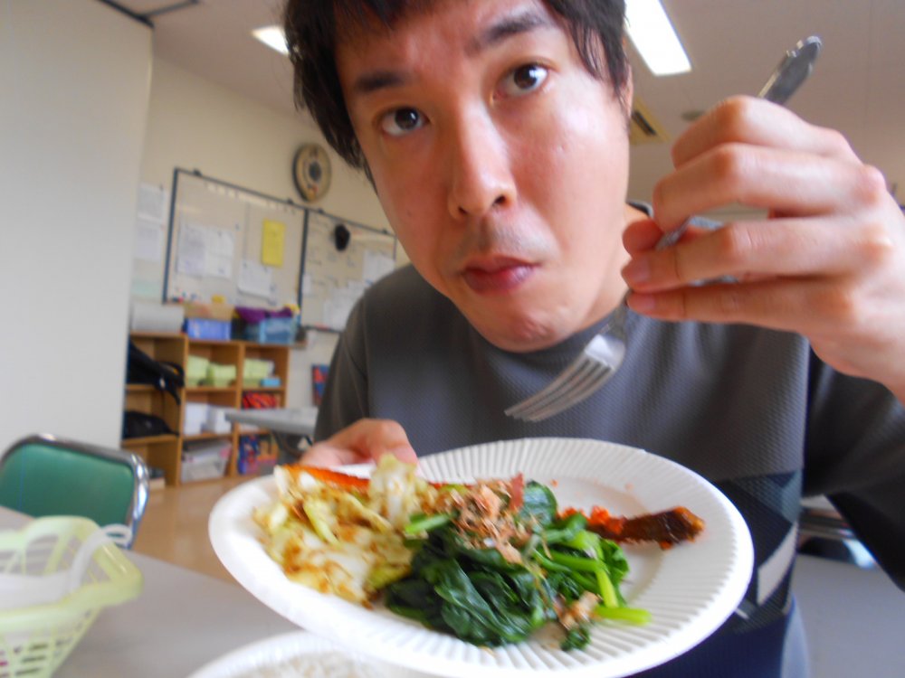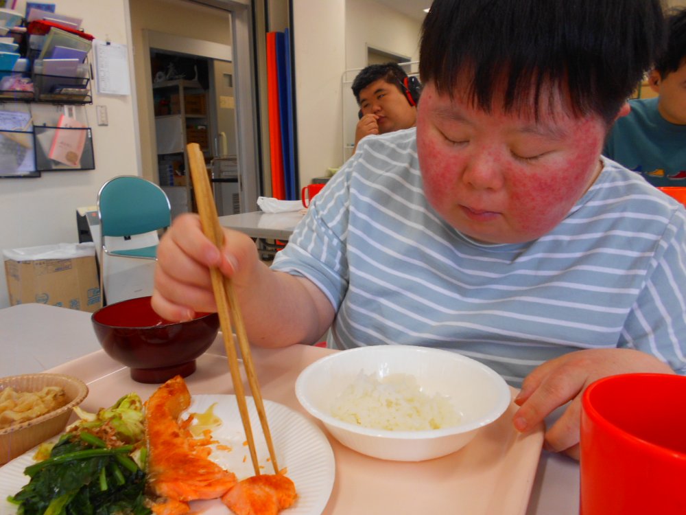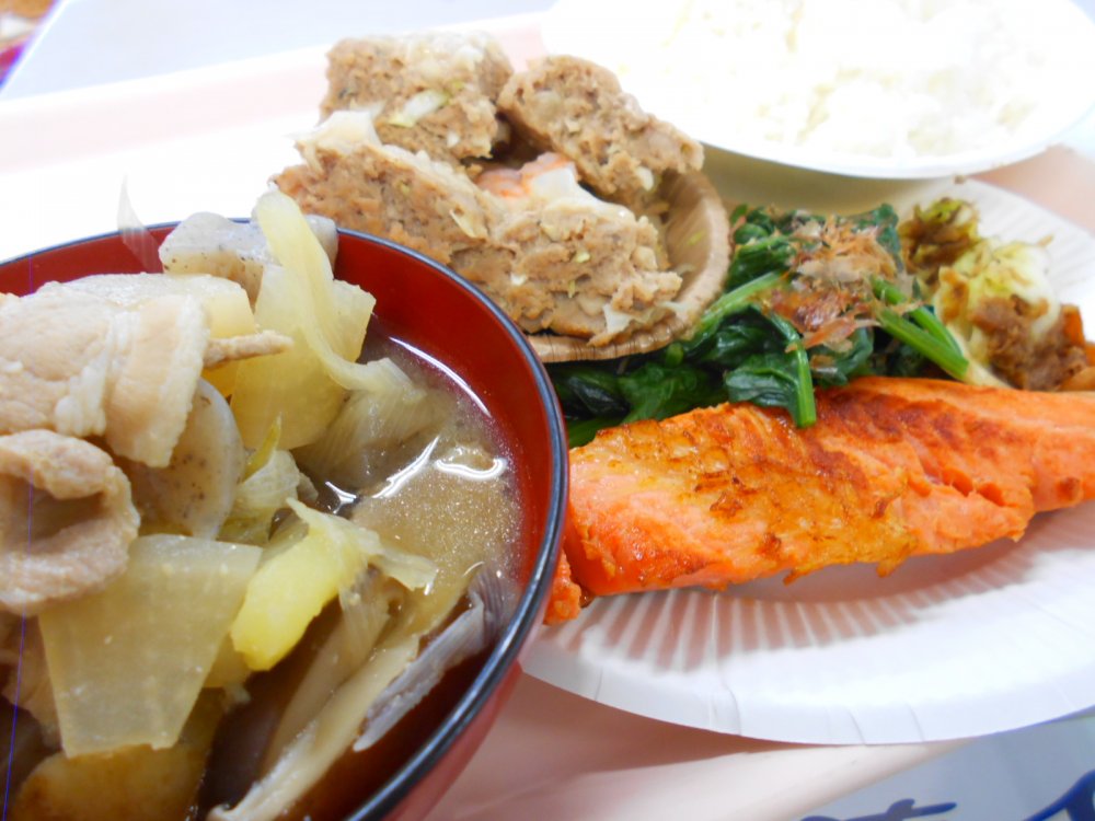 ご飯、大きな海老シューマイ、鮭の塩焼き、豚汁、ほうれん草のおひたし、キャベツのあさづけ(梅カツオ風味)
