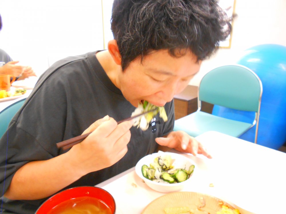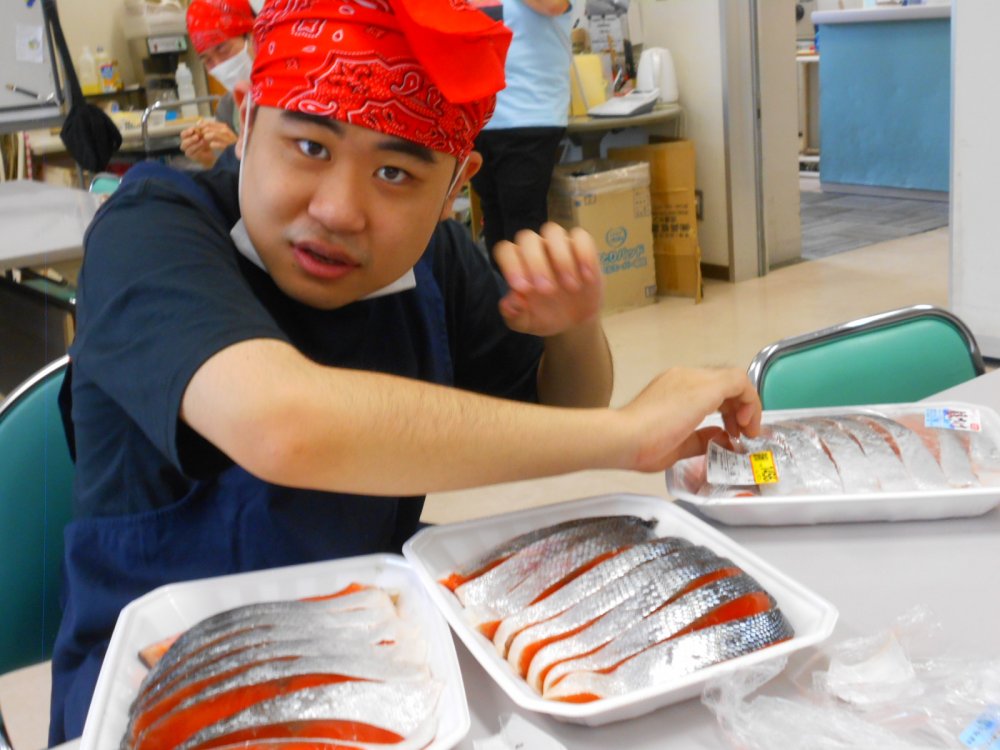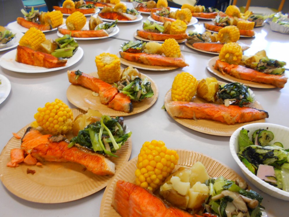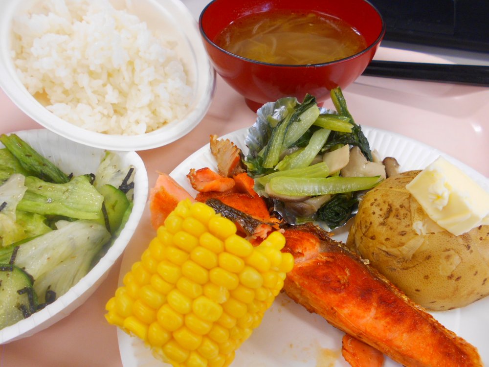 ご飯、焼き鮭、こまつなときのこのバター炒め、じゃがバター、チョレギサラダ、トウモロコシ、オニオンスープ、デザート(フローズンストロベリーヨーグルト)