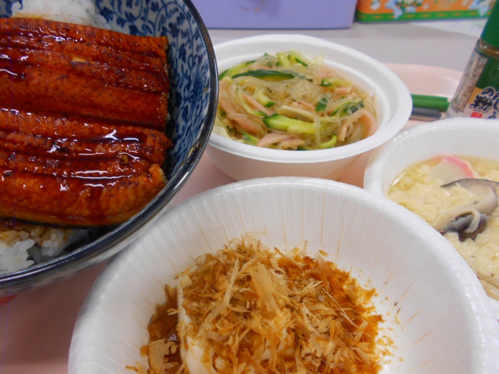うな丼、春雨サラダ、茶わん蒸し、冷ややっこ(鰹節多くて見えまさんがw)、オクラとわかめのお吸い物(写真ないですがw)