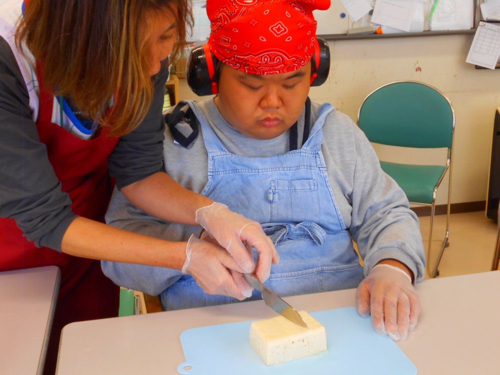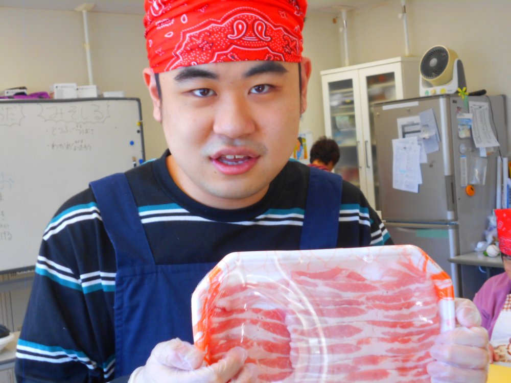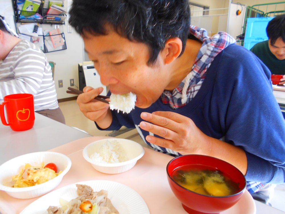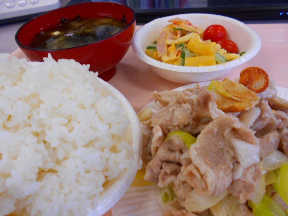 ご飯、豆腐とわかめの味噌汁、ネギ塩豚バラ焼き肉、マカロニサラダ