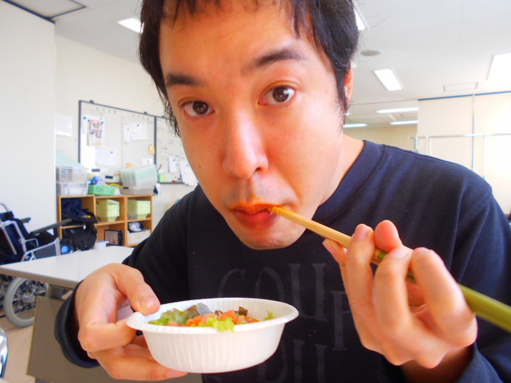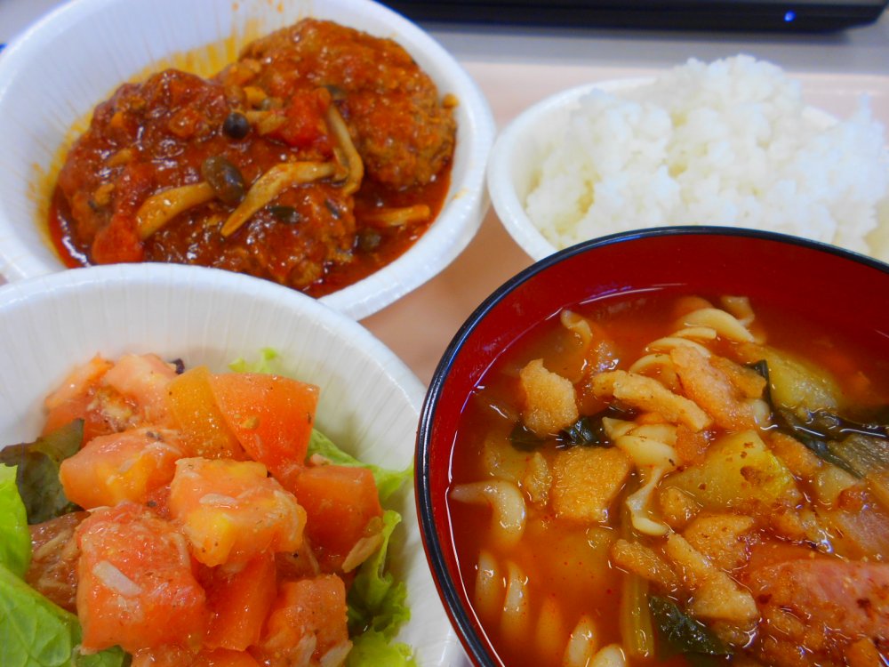 ご飯、ハンバーグ2個、ミネストローネ、トマトサラダ。