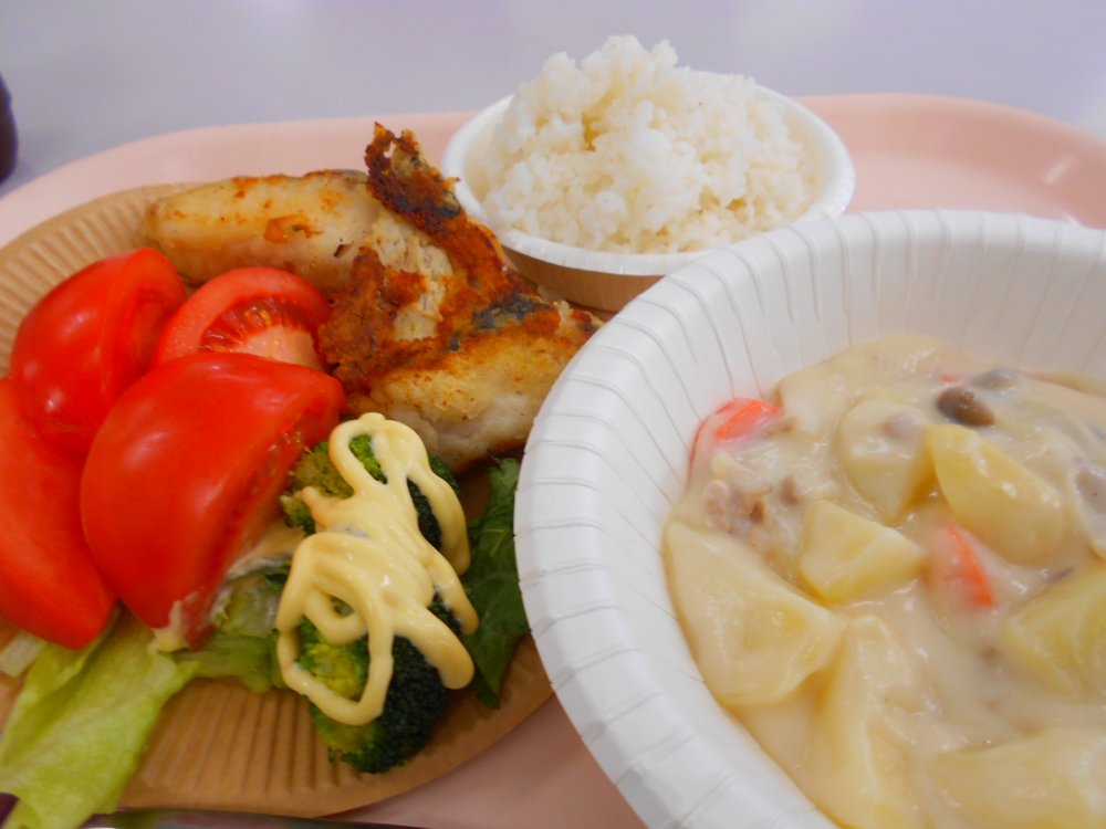 ご飯、タラのやみつきソテー、クリームシチュー、サラダ