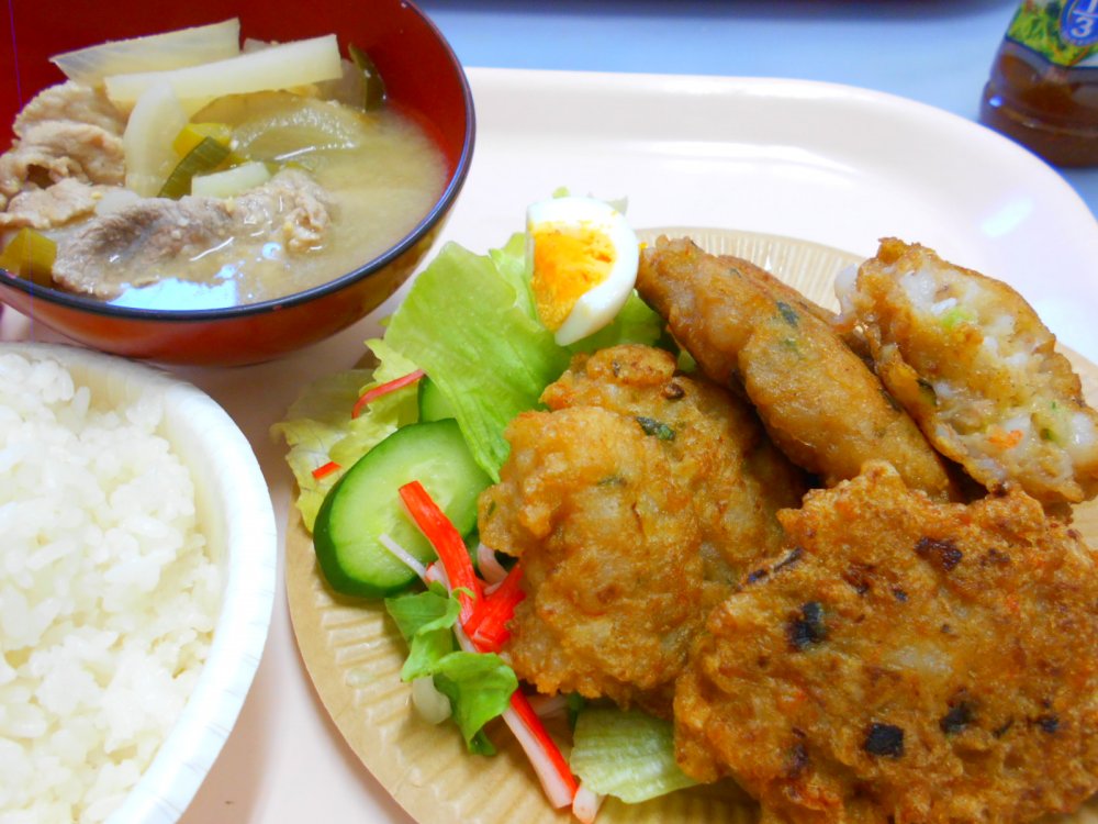 ご飯、豚汁、サラダ、えびしんじょ。