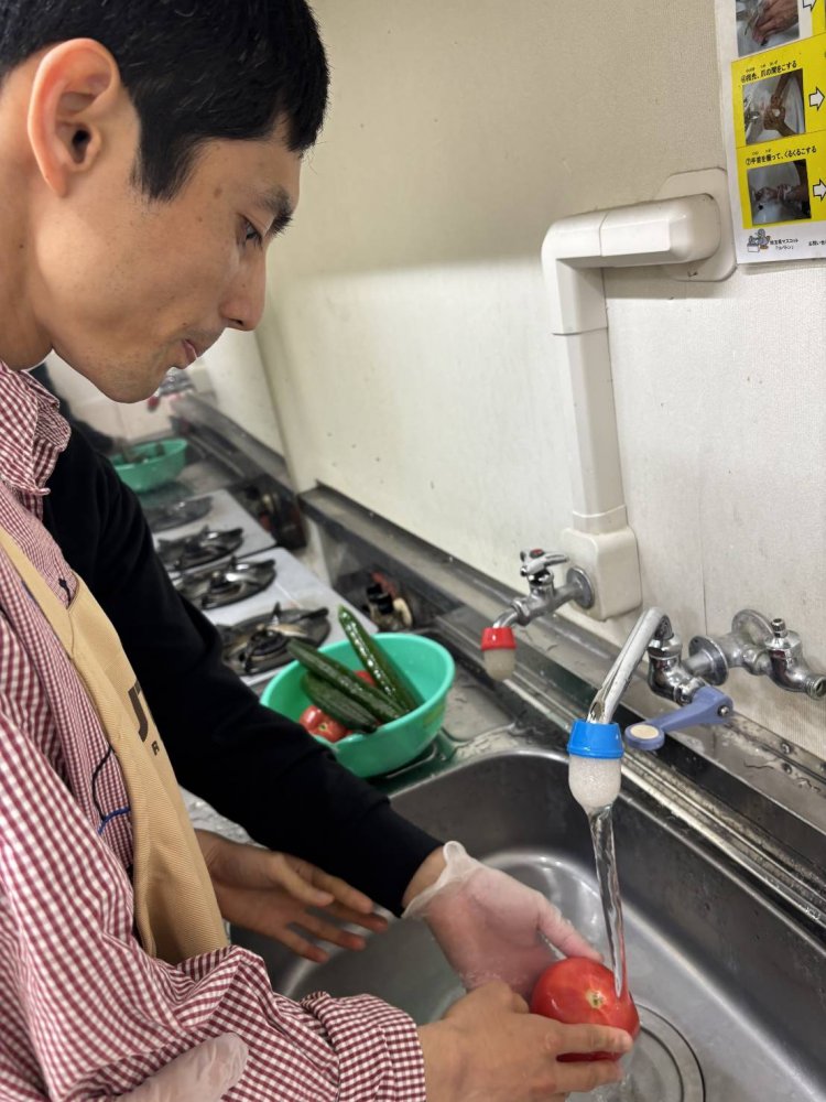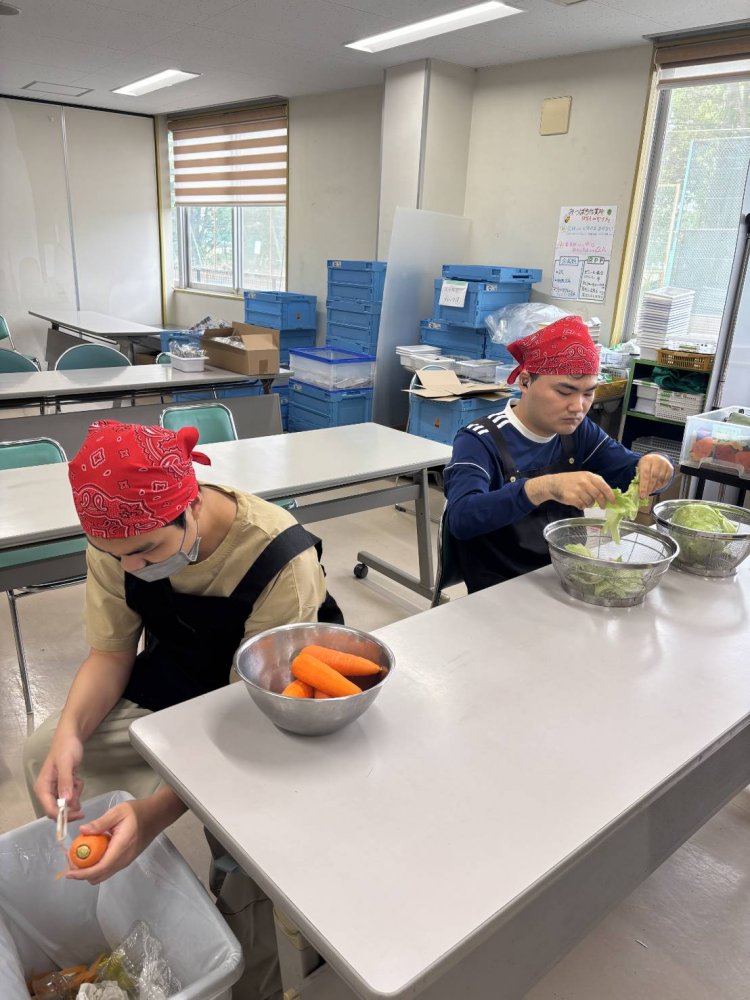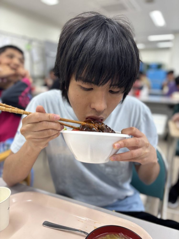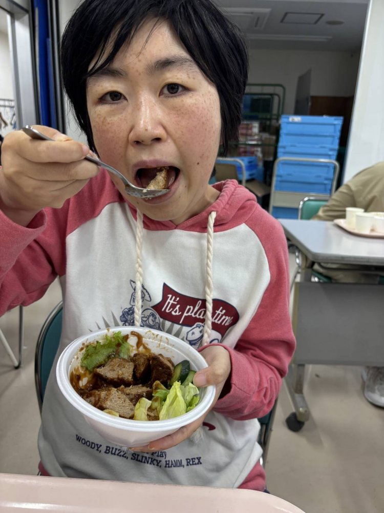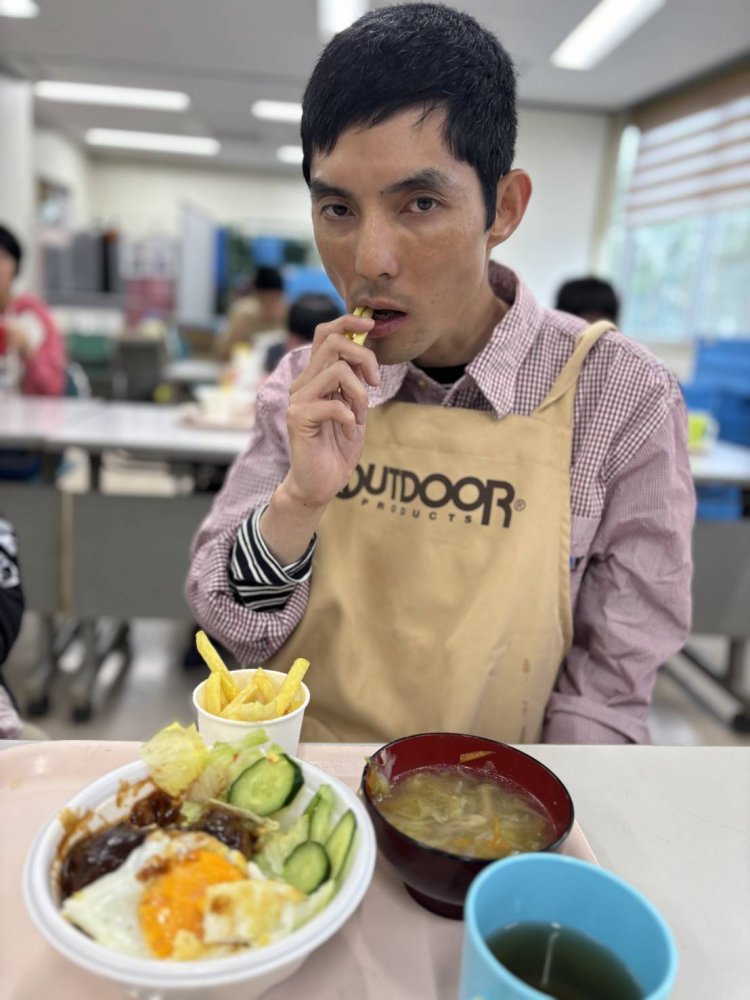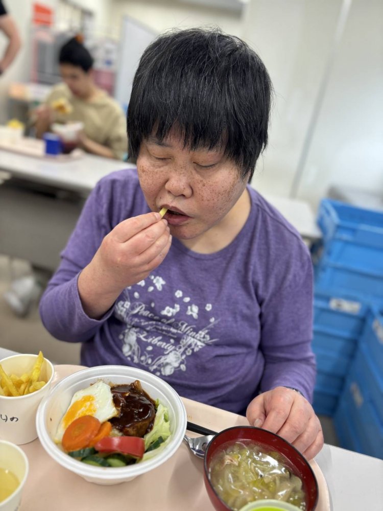 ご飯にレタス、その上に大きなハンバーグと目玉焼きを乗せ、きゅうりとトマトを添え、見た目も鮮やかなボリューム満点のロコモコ丼が完成しました。大人気のフライドポテトとジュースもあり、みなさん大満足だったのではないでしょうか(^_^)/