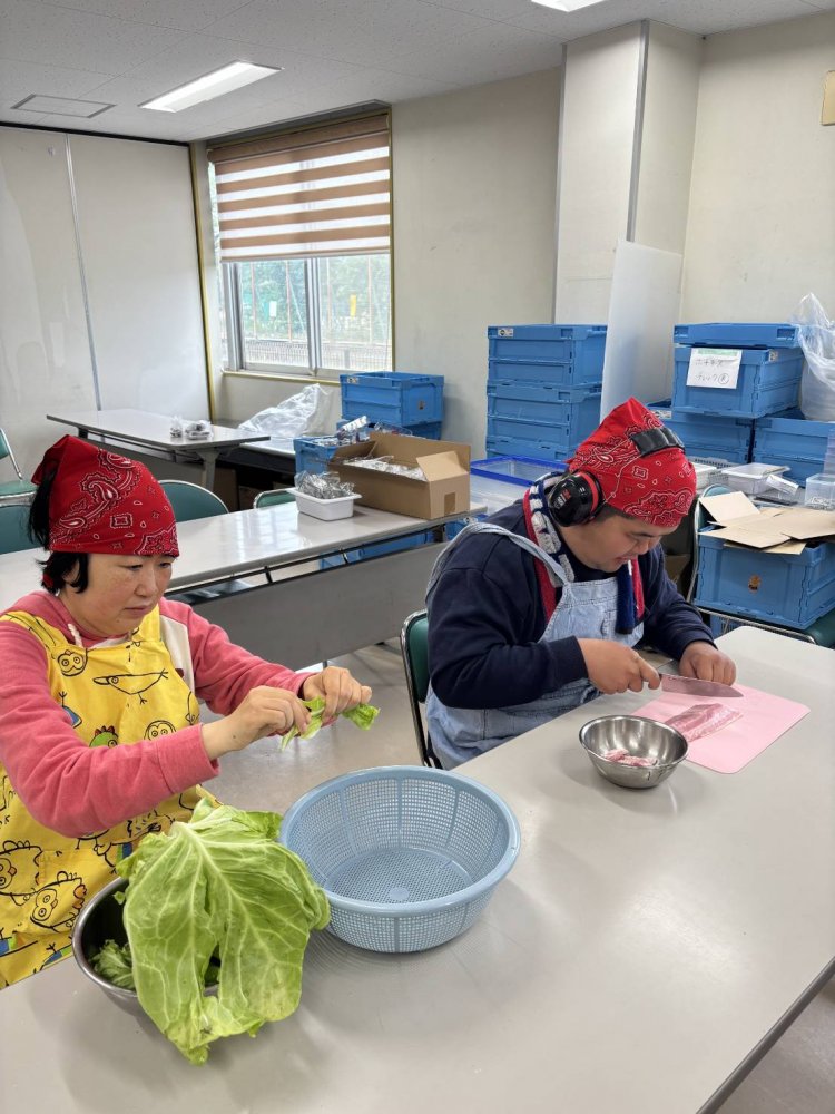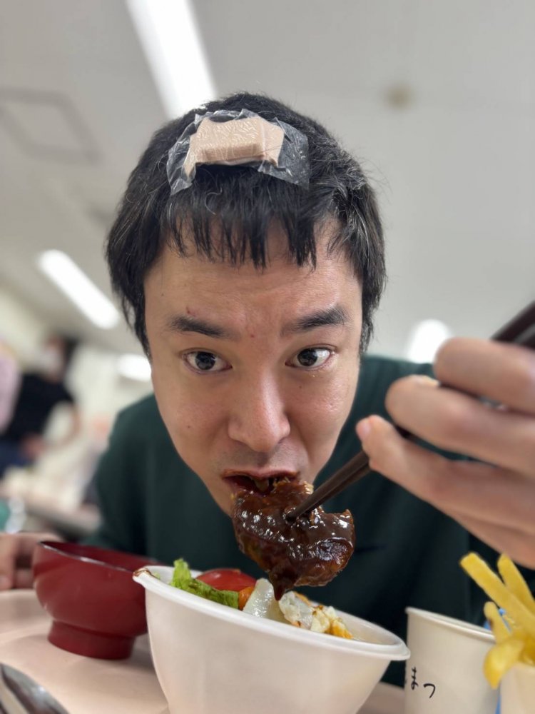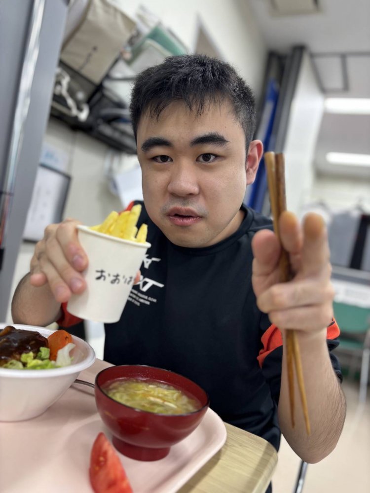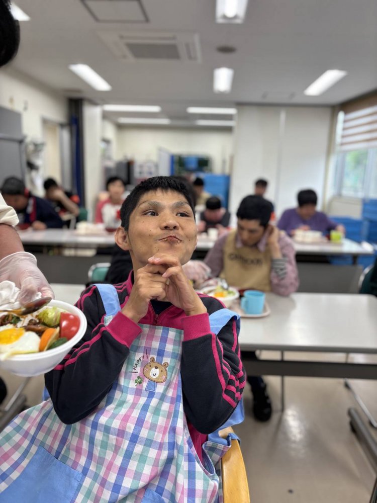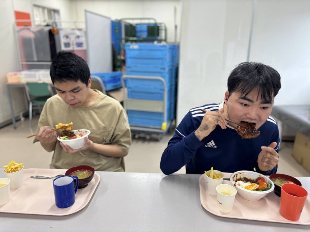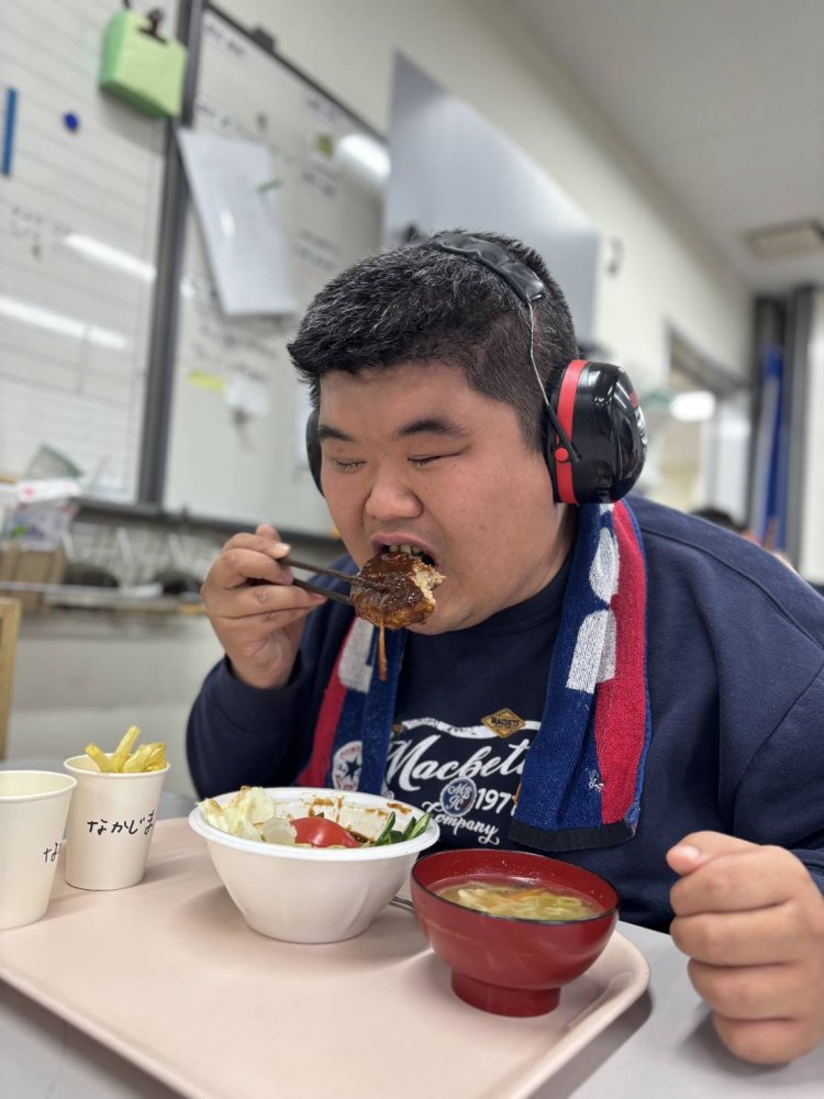 ご飯にレタス、その上に大きなハンバーグと目玉焼きを乗せ、きゅうりとトマトを添え、見た目も鮮やかなボリューム満点のロコモコ丼が完成しました。大人気のフライドポテトとジュースもあり、みなさん大満足だったのではないでしょうか(^_^)/